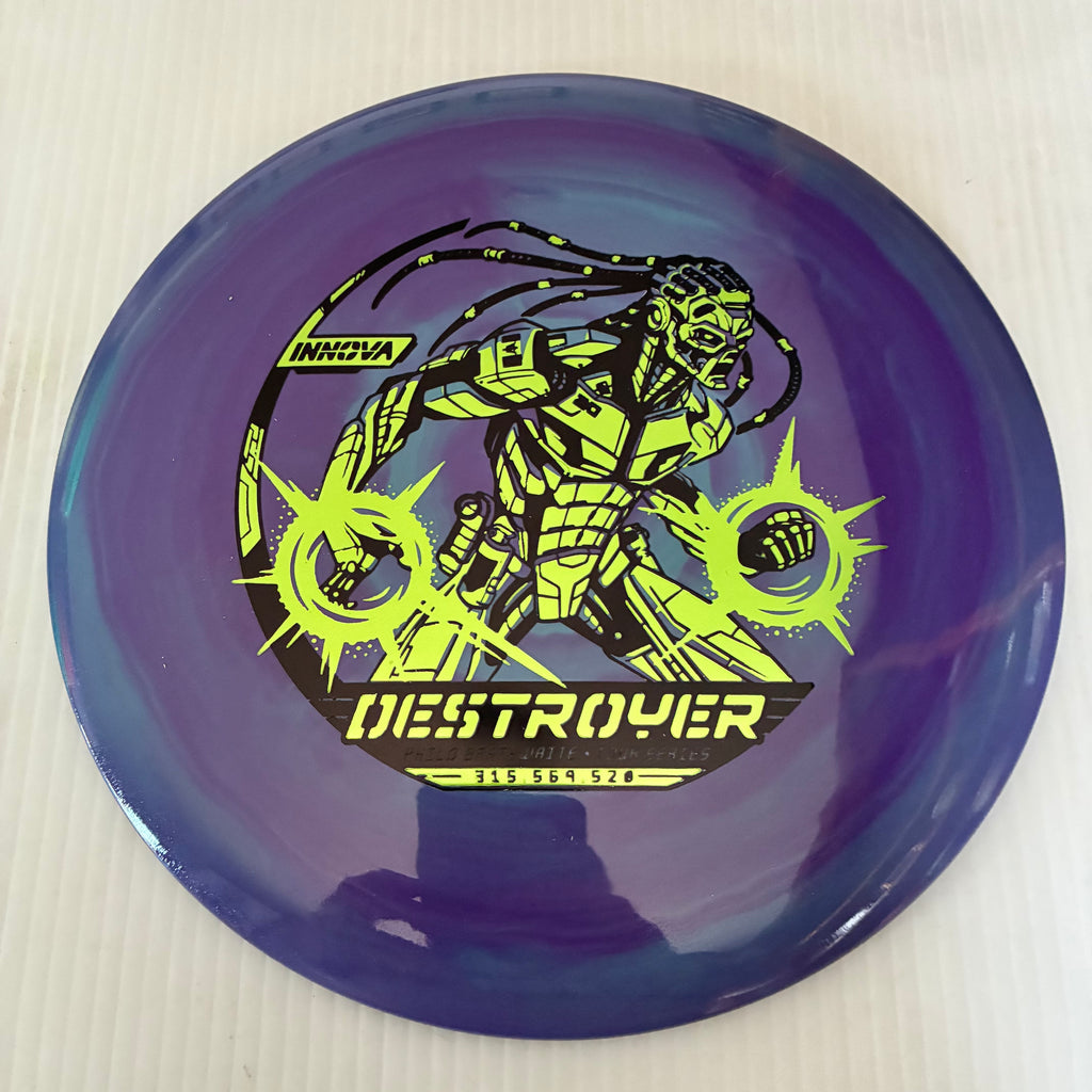 The Destroyer is a very fast stable long distance driver. This disc is much like a faster Wraith, but with a little more high and low speed stability. Great disc for sidearm throwers and those with lots of power. Can handle headwinds and throws with off axis torque.